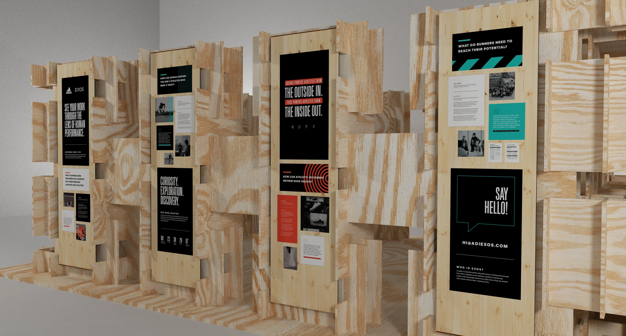 The team was tasked with identifying and communicating the relationship between EXOS and one of its major partners, Adidas. Highlighting how the two companies work together and the history with one another through case studies and visuals. We had no access to the space, as it sat in Germany.